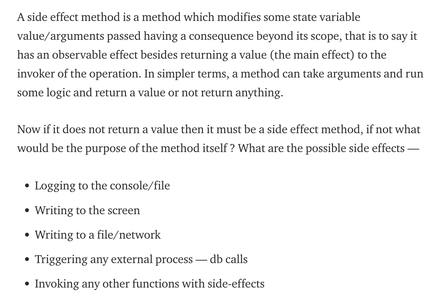 엄밀하게 따지고 들어가 보자면 단순 로깅, System.out.println 마저도 side-effect에 해당한다