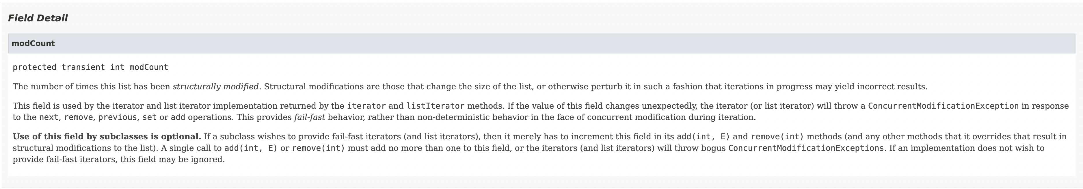 modCount란 List 시리즈들의 Iterator 헬퍼 클래스인 private class Itr implements Iterator<E>에서 사용되는 변수다