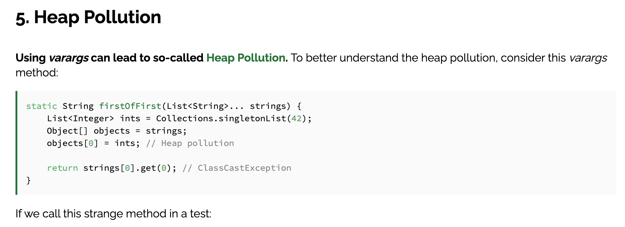 자바 9 이후로는 List.of() 쓰거나 이전 버전은 Arrays.asList() 쓰면 Heap Pollution 같은 것은 간단하게 해결되는 문제다