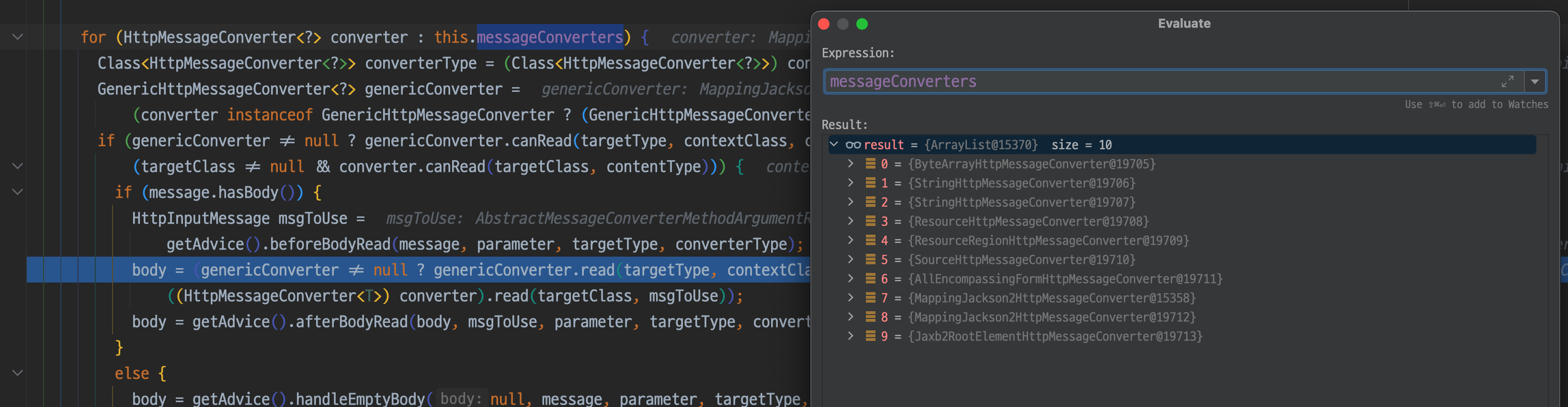 여기서 inputMessage를 evaluation 해보면 EmptyBodyCheckingHttpInputMessage가 나와