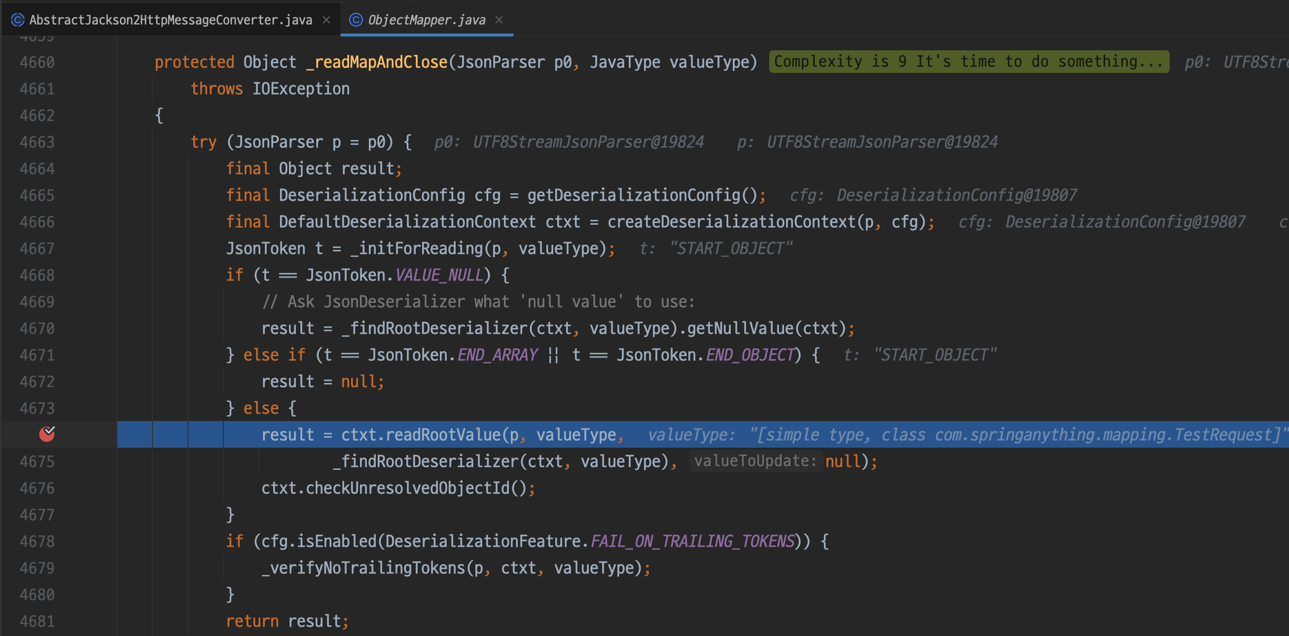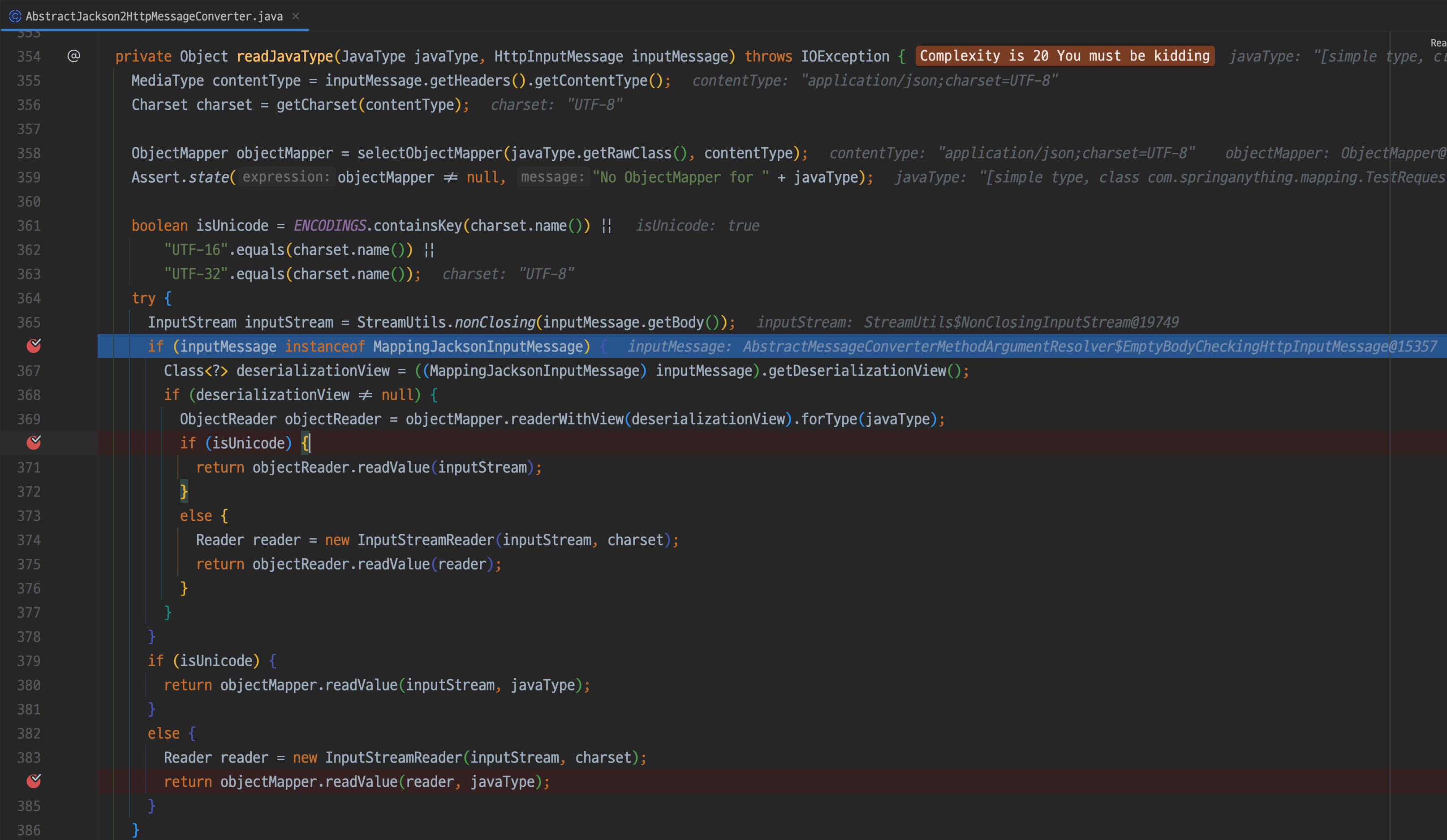 결과적으로 380라인의 objectMapper.readValue(inputStream, javaType)을 타게 된다