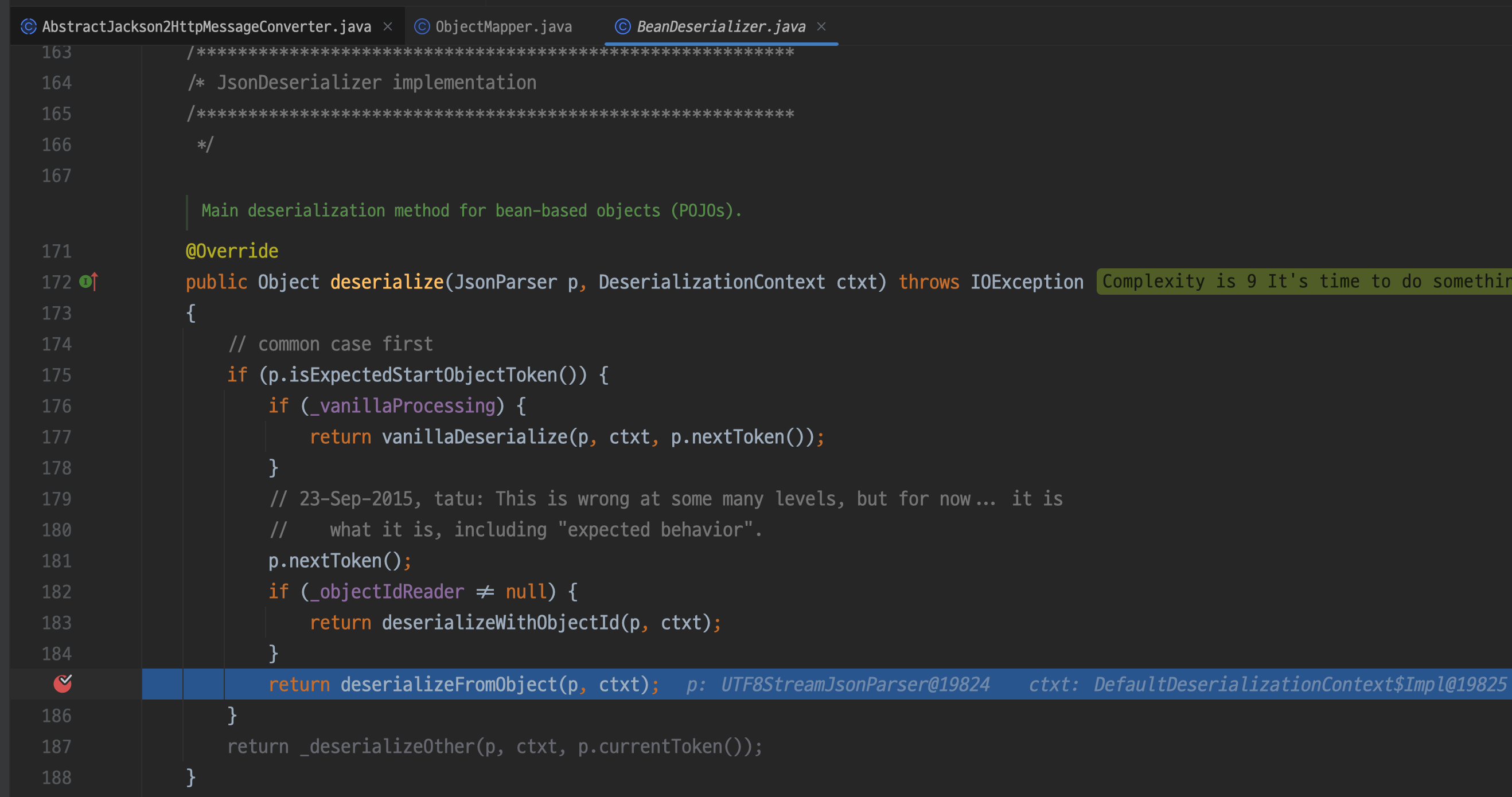 이전에 호출되었던 _findRootDeserializer(ctxt, valueType)에서 BeanDeserializer가 반환된 모습이다