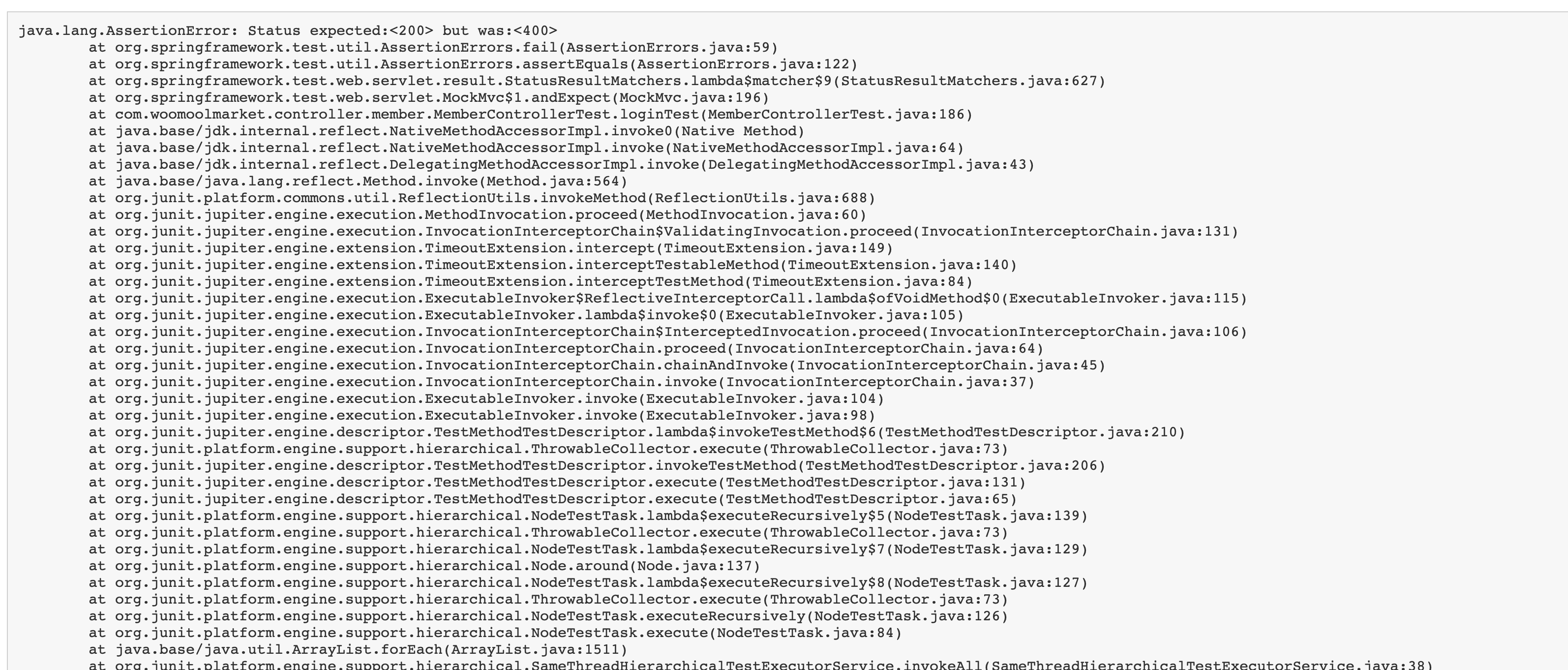 테스트에 대한 응답으로 200을 기대했으나 400이 나왔다는 건 알겠는데 그 외에는 외계어다
