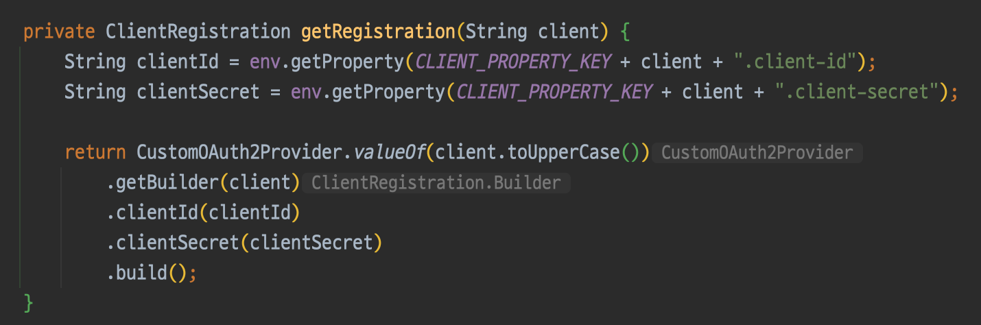 getRegistration method에서 parameter인 (String client)는 연동시킬 사이트의 이름을 의미한다