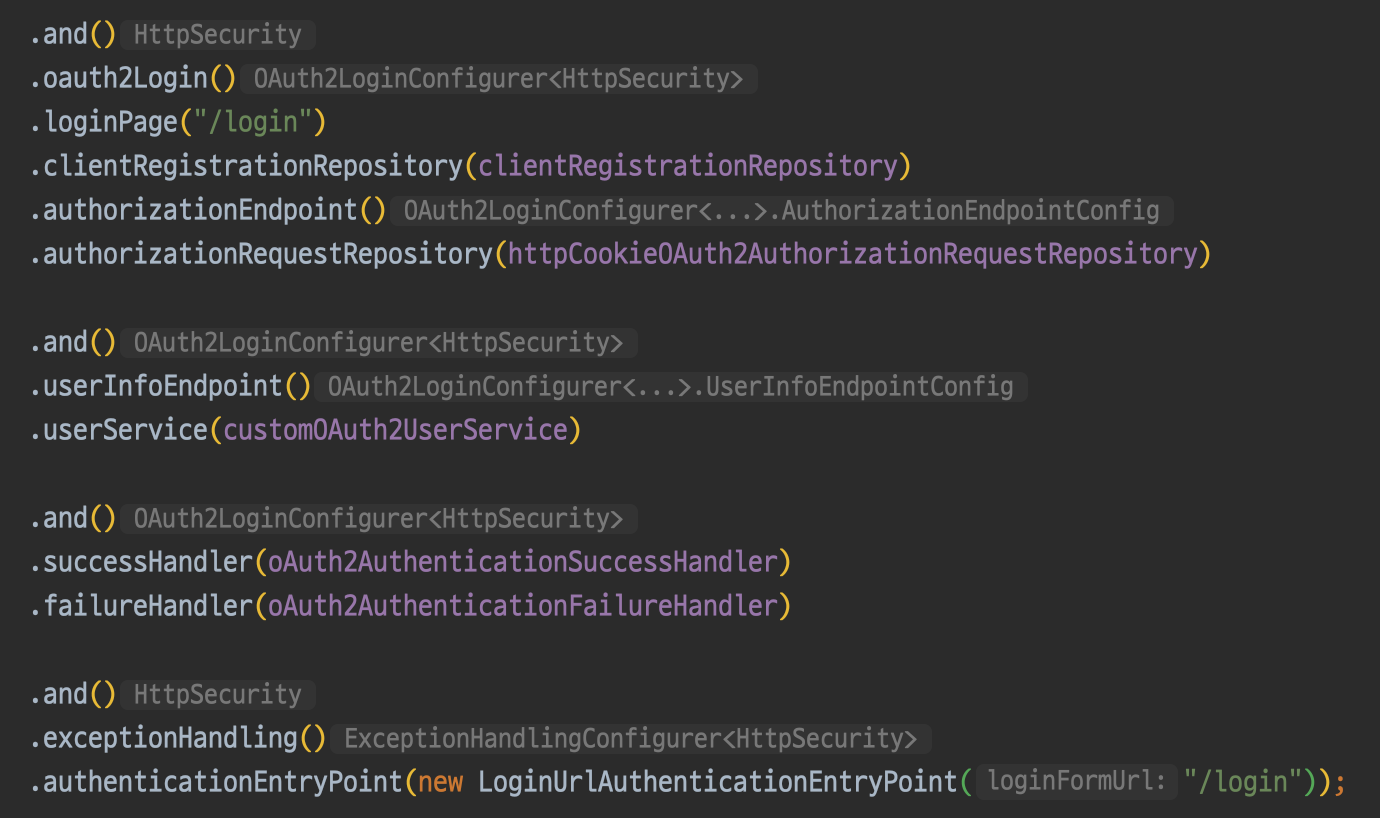 다음 사진은 SecurityConfig에서 분리해내고 싶던 OAuth2 관련 설정이다