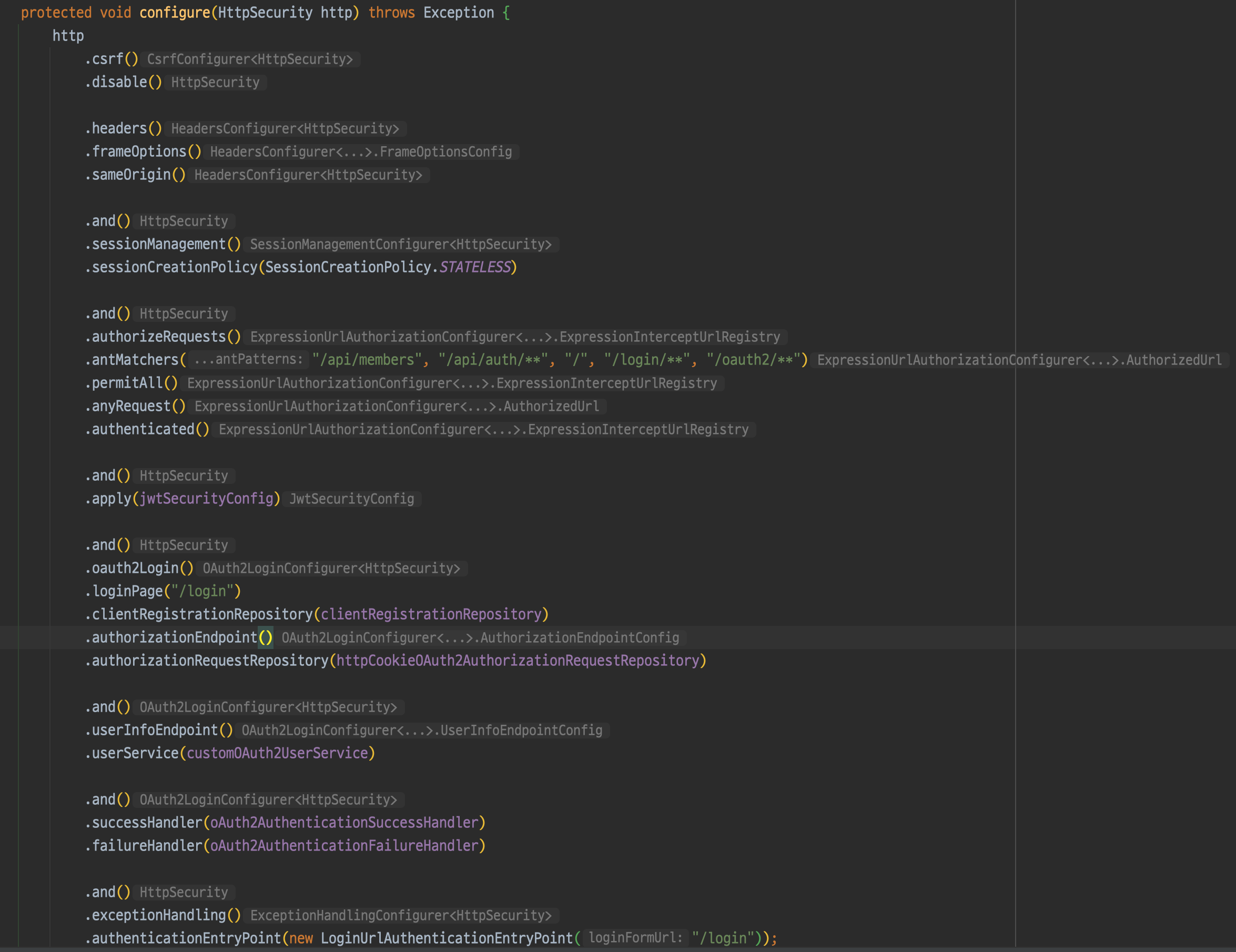 다만 clientRegistrationRepository, httpCookieOAuth2AuthorizationRequestRepository, customOAuth2UserService, oAuth2AuthenticationSuccessHandler, oAuth2AuthenticationFailureHandler를