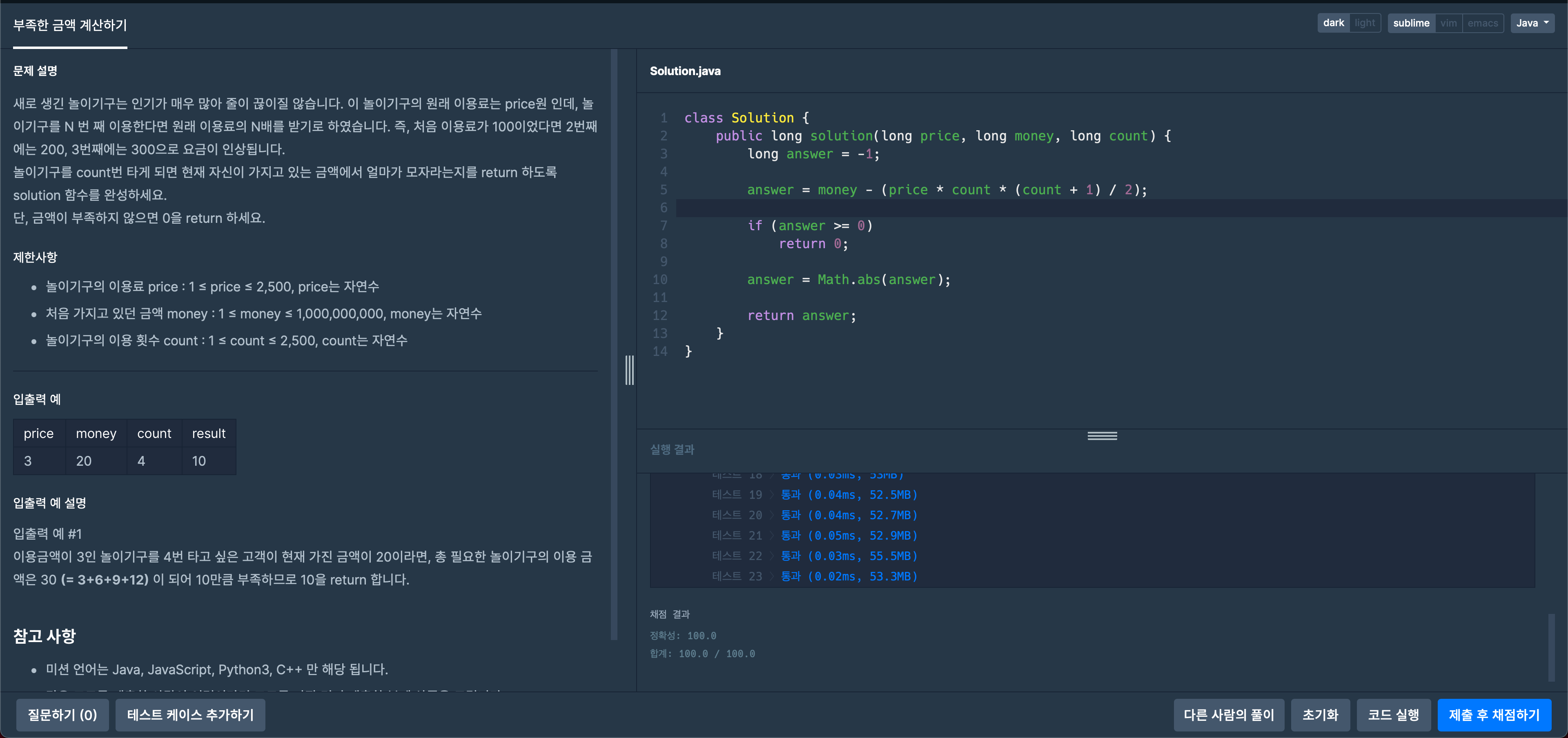 자바로는 다른분들 코드를 참고해 parameter 를 long 으로 바꿔 제출했더니 통과했다